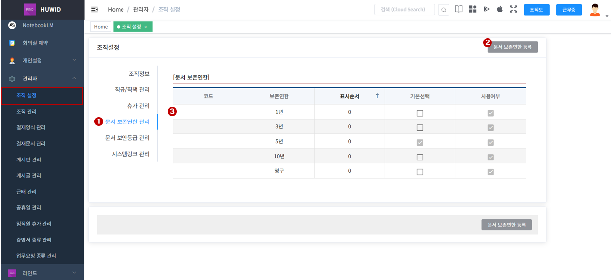 - 조직 설정 영역 내 왼쪽 탭에서 '문서 보존연한 관리'(1)를 클릭하세요.