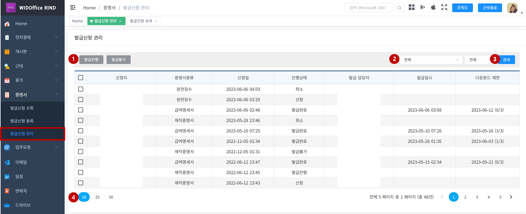 라인드 발급신청 관리는 임직원분들의 증명서 발급 신청 내역을 관리하는 기능을 제공하고 있습니다.