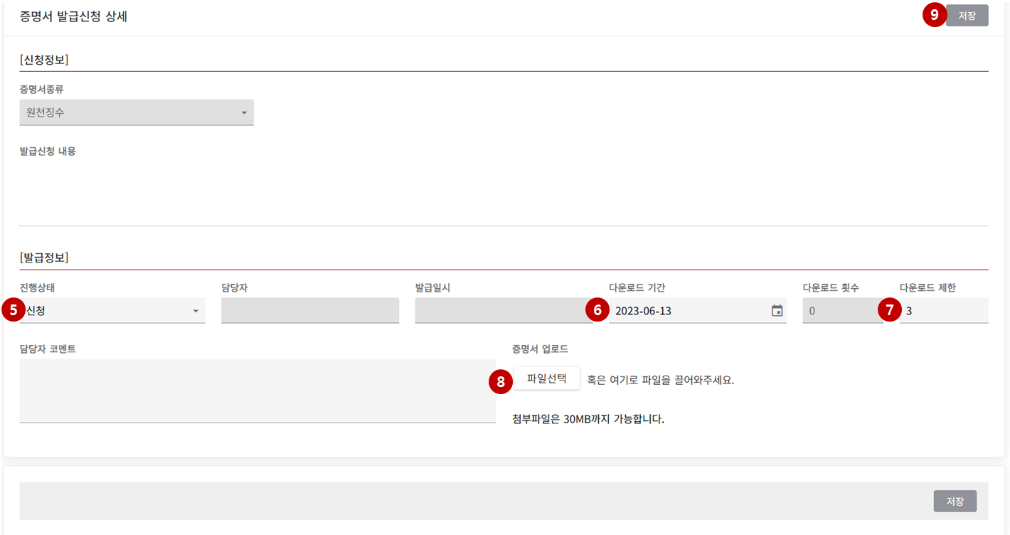 - '저장'(9) 버튼을 클릭하면 증명서 발급 신청 처리가 완료됩니다.