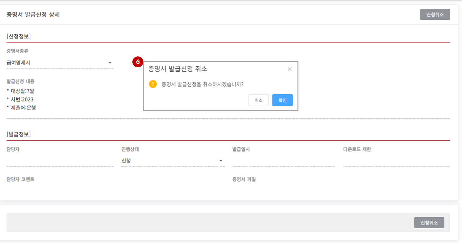 - 증명서 발급신청 상세 조회 후 '신청취소'(6) 버튼을 클릭하세요.