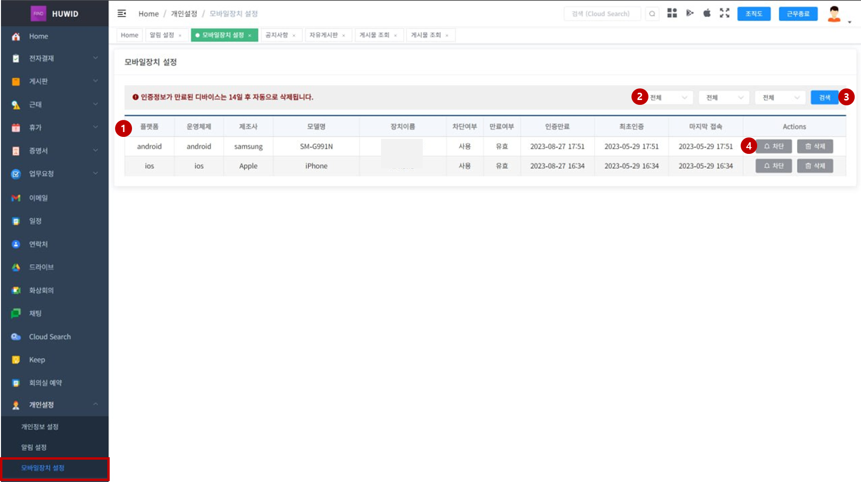 모바일장치 설정에는 등록된 모바일 장치의 사용여부를 관리할 수 있습니다.
