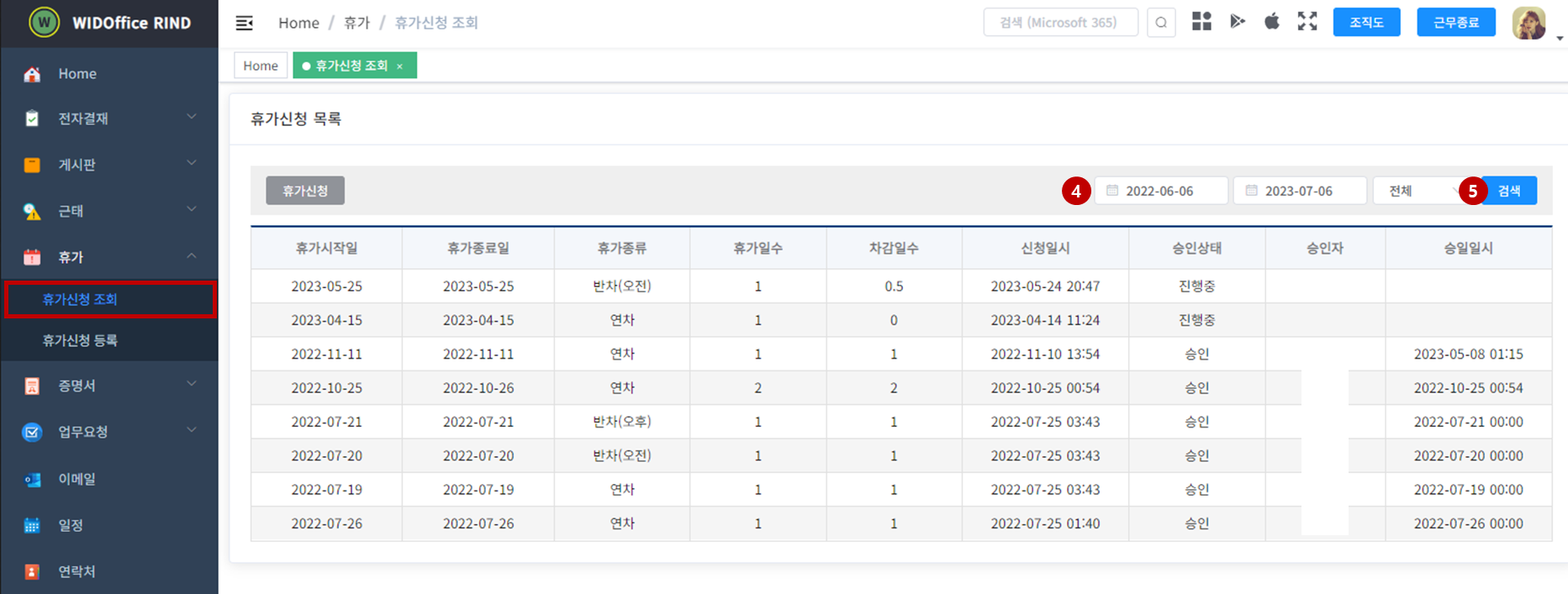 - 검색 조건(4)를 변경 후 '검색'(5) 버튼을 클릭하면 다른 조회 조건으로 휴가신청 내역을 조회할 수 있습니다.