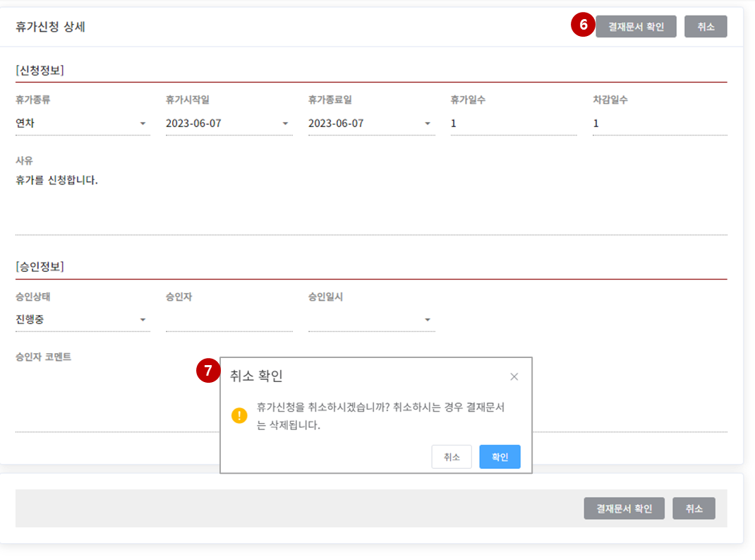 - 상세화면에서 '결재문서 확인'(6) 버튼을 클릭하면 연결된 전자결재 문서로 이동합니다.