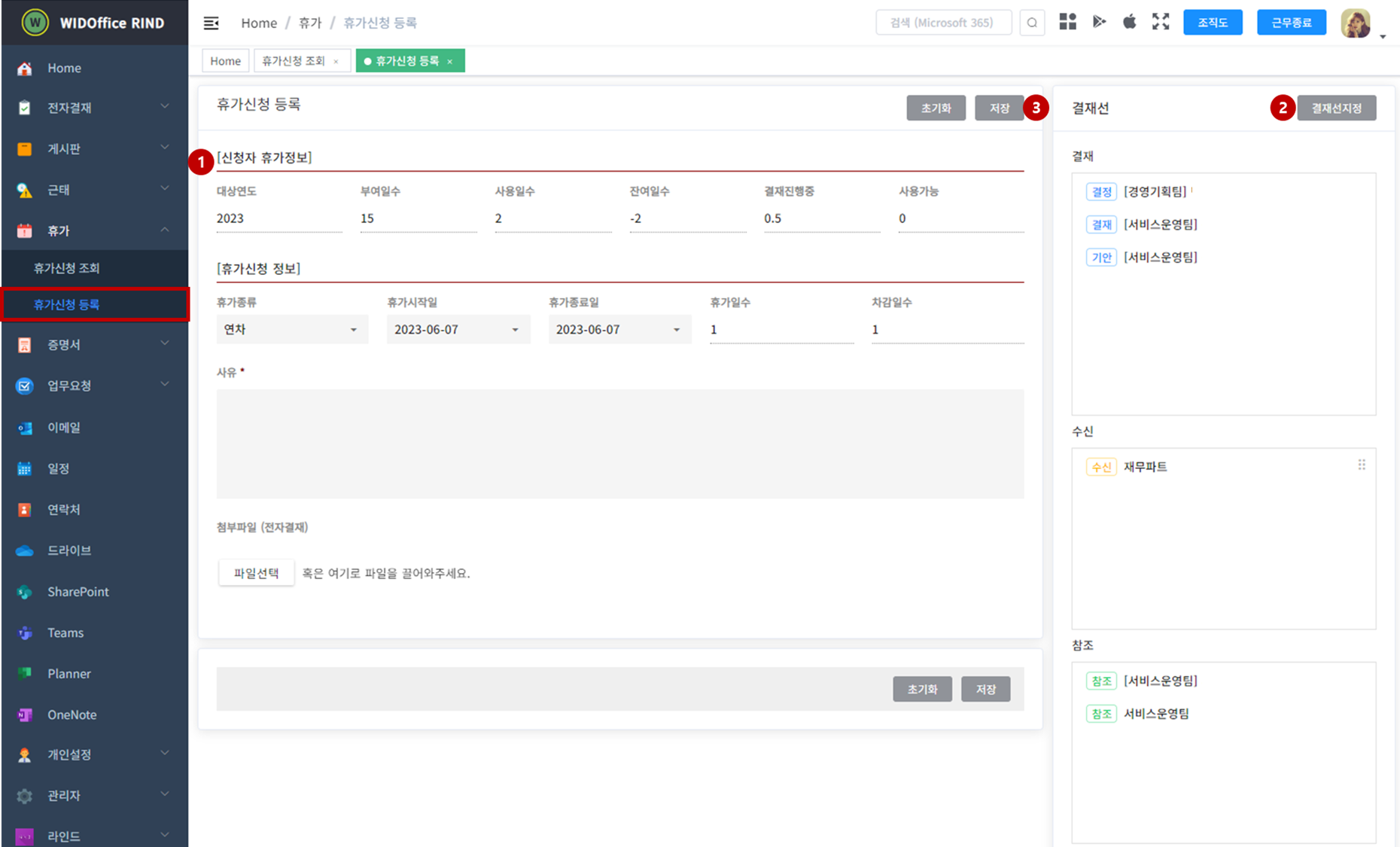 - '저장'(3) 버튼을 클릭하면 휴가신청이 완료됩니다.