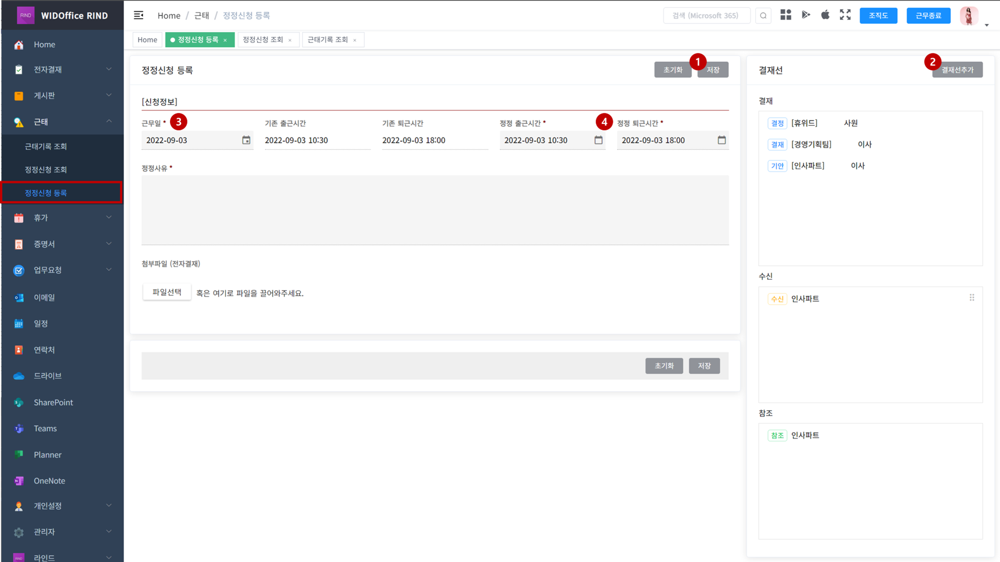> 근무일 선택 시 기존 출/퇴근 시간은 자동으로 지정 - 정정 할 시간(4)과 사유 등 정정신청 관련 정보를 입력하세요.