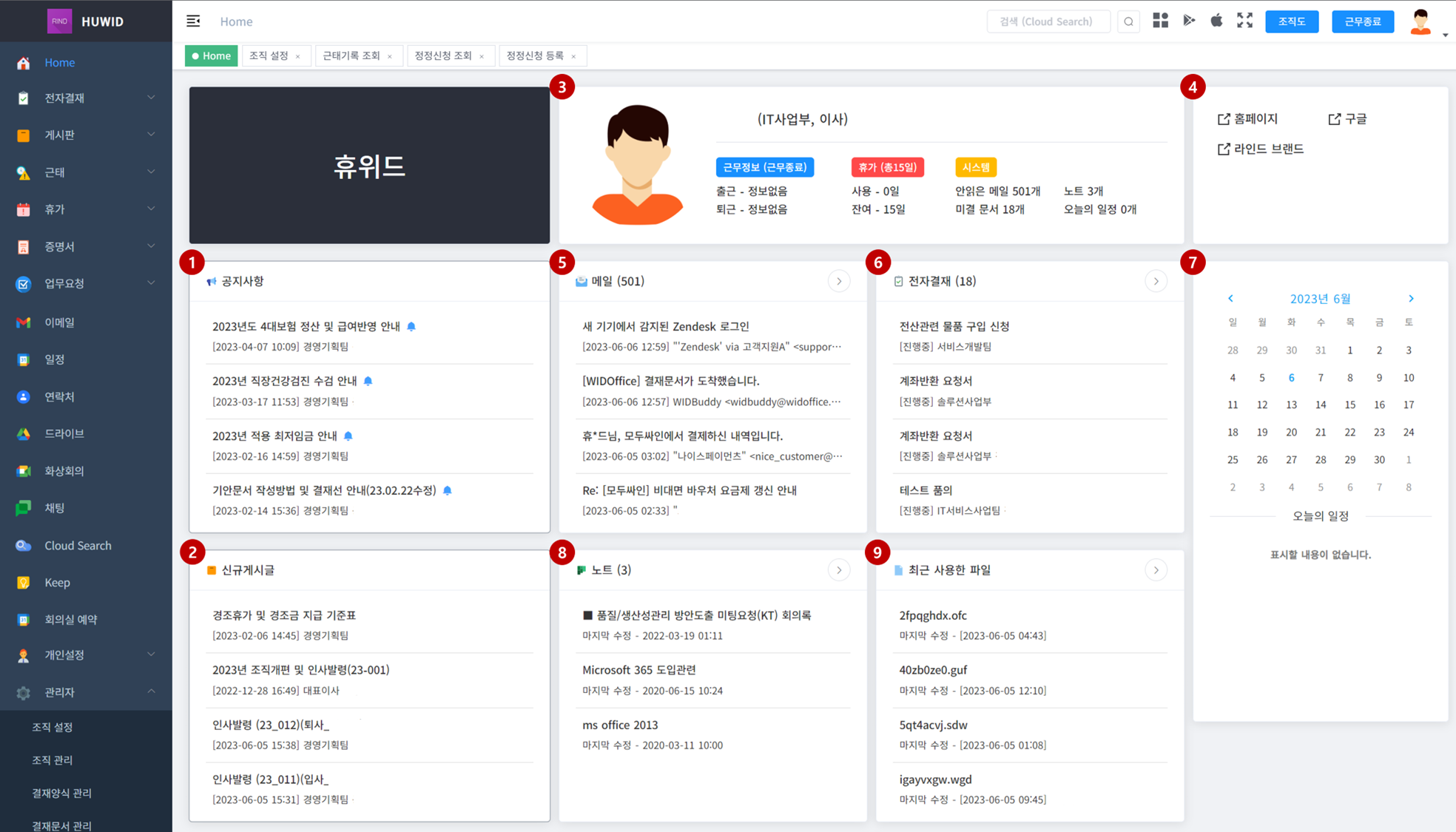 사용자의 개인정보와 근무상태, 휴가, 시스템 요약 정보 등이 표시됩니다. - 메일 (5)
